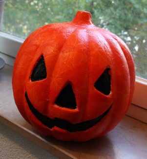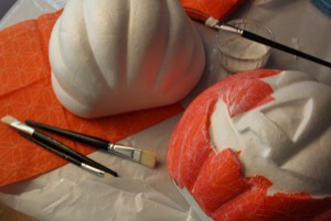 Travailler chez Schleiper va finir par me coûter cher! Cette fois-ci, j’ai testé le collage de serviettes sur une citrouille en polystyrène. Je ne fête pas spécialement Halloween mais elle me plaisait vraiment bien. Réalisation en octobre 2011.