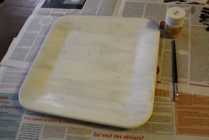 Lorsque tout est bien sec, vous pouvez ajouter une couche de vernis. Ici, étant un plat, il s’agit de vernis alimentaire.