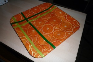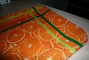 Ici j’ai utilisé un papier avec un dessin beaucoup plus structuré. Des rondelles d’orange. Je vous conseille vivement d’utiliser les feuilles sans les déchirer en petits morceaux pour garder l’unité du dessin. J’ai caché le joint entre les papiers avec du ruban, imbibé de colle vinylique.