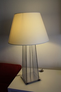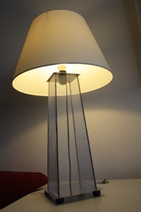 La base est constituée de plaques d’Aluminium et de montant en acier. Des grillages métalliques ferment le tout. J’avais tout d’abord pensé souder les pièces ensemble. Pas très concluant. Une fixation mécanique avec des boulons me semblait trop lourde visuellement. J’ai du me rabattre sur la super glu! Au moins ça marche! Pour faire passer le fil électrique, j’ai du démolir l’interrupteur et en placer un nouveau. J’ai acheté l’abat jour tout fait. Pour les pieds, j’ai tout simplement utilisé des bouchons de champagne raccourcis et peint en noir.